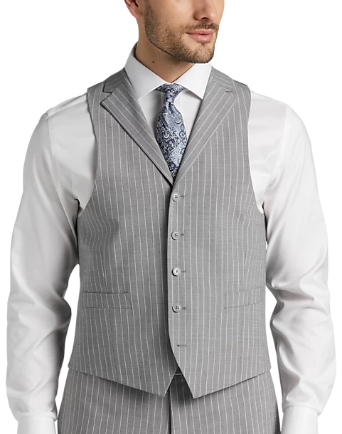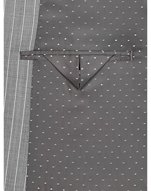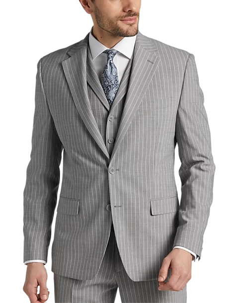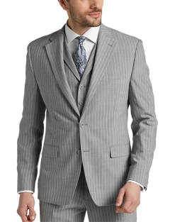In a Classic Fit this fine suit from Michael Strahan features a traditional gray stripe. A notch lapel coat flat-front slacks and a five-button vest complete this versatile look.