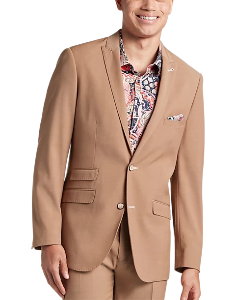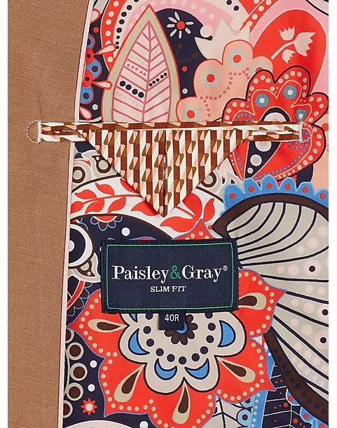 - 74% polyester 24% rayon 2% spandex|Two button|Peak lapel|Side vents|Coordinating pieces sold separately|Slim Fit|Paisley & Gray|